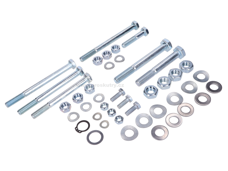 Sada šroubů obsahuje šrouby pro upevnění středového stojanu, pružiny středového stojanu, trubky stupačky, tlumiče s stupačkami spolujezdce a šrouby pro upevnění motoru.