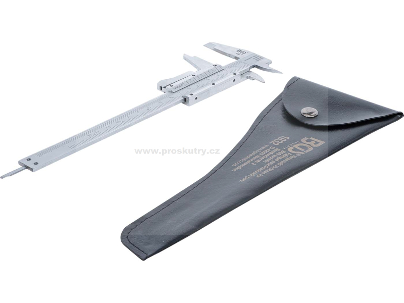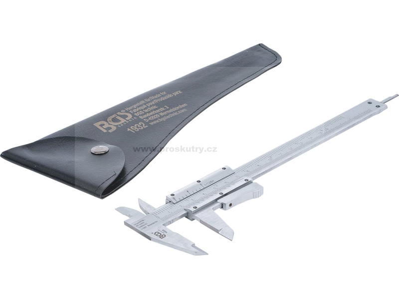 Analogové přesné posuvné měřítko s měřicím rozsahem 0–150 mm a noniovou stupnicí 1/20 mm. S metrickou a imperiální stupnicí. Vhodné pro vnitřní, vnější a hloubkové měření. Posuvné měřítko je dodáváno s koženkovým pouzdrem pro skladování.