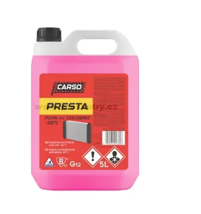CARSO PRESTA G12 je kvalitní nemrznoucí chladicí kapalina určená pro moderní chladicí systémy osobních i užitkových vozidel. Kapalina poskytuje spolehlivou ochranu motoru proti přehřátí v letním období a proti zamrznutí v zimě. Díky moderní technologii organických inhibitorů koroze chrání všechny kovové i slitinové části chladicí soustavy, včetně hliníkových komponentů a vodního čerpadla.