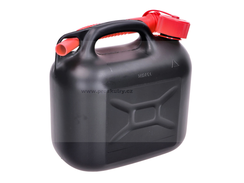 Černý kanystr na palivo o objemu 5 l. Kanystr je dodáván s hrdlem a dětským bezpečnostním uzávěrem (ZU-231330).