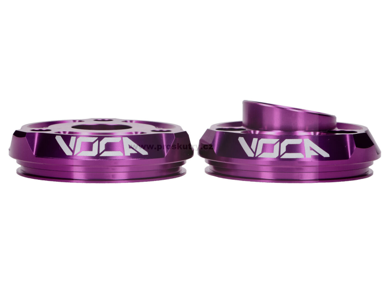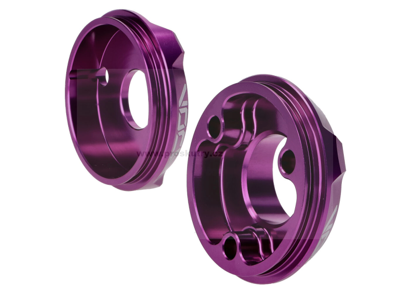 Koncové krytky VOCA pro zadní tlumiče výfuku vyrobené z hliníku ve fialové barvě.