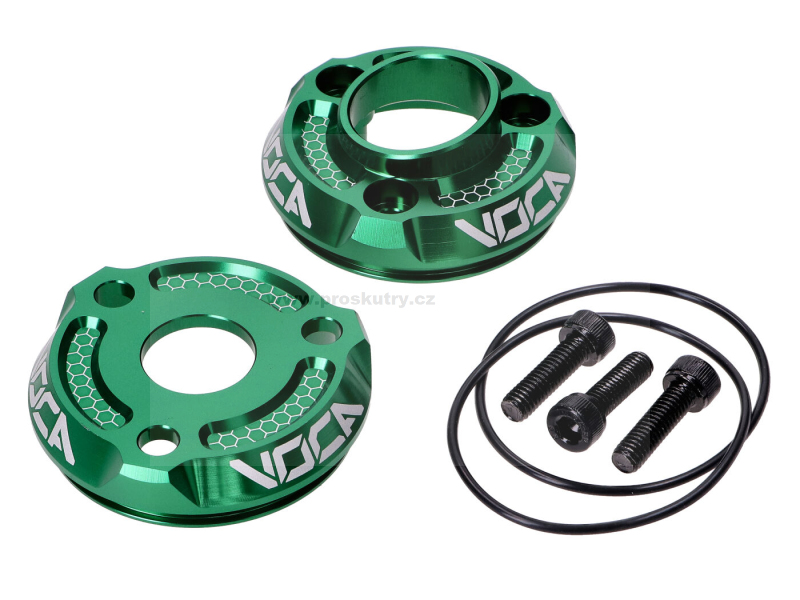 Koncové krytky VOCA pro zadní tlumiče výfuku vyrobené z hliníku v zelené barvě.