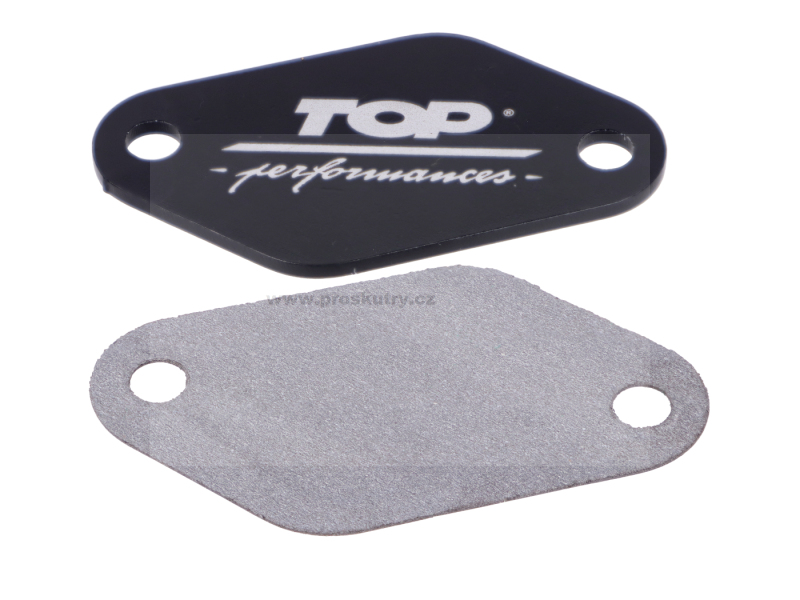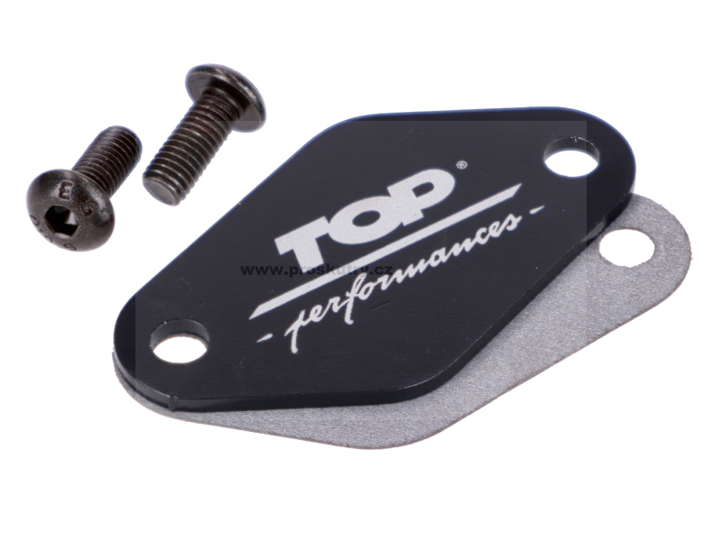 Černý kryt olejového čerpadla od Top Performances, vhodný pro mopedy s motory Minarelli AM nebo Derbi/Piaggio EBE, EBS, D50B. Včetně těsnění a šroubů.