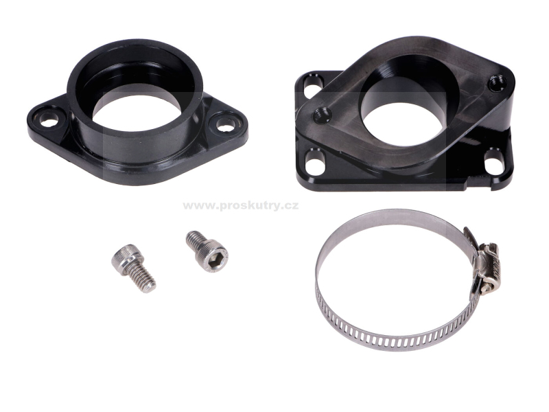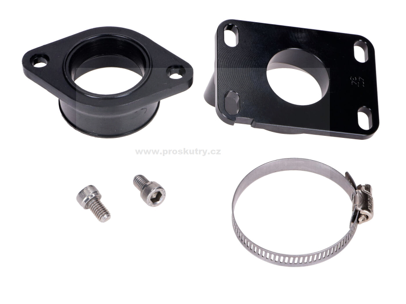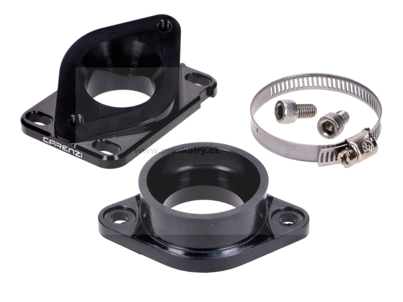 Sací potrubí Carenzi pro montáž karburátorů PWK velikosti 30, vhodné pro manuální mopedy Minarelli AM6 a Derbi D50B0. Včetně objímky a šroubů.