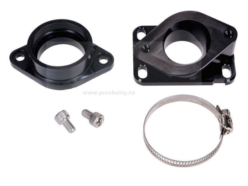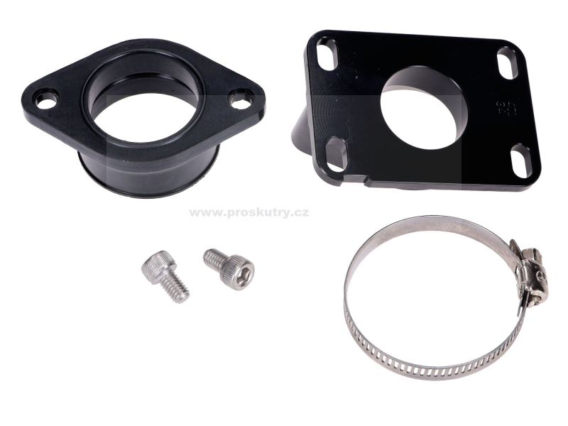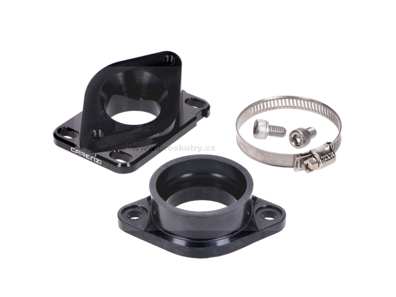 Sací potrubí Carenzi pro montáž karburátorů PWK 34 mm, vhodné pro manuální mopedy Minarelli AM6 a Derbi D50B0. Včetně svorky a šroubů.