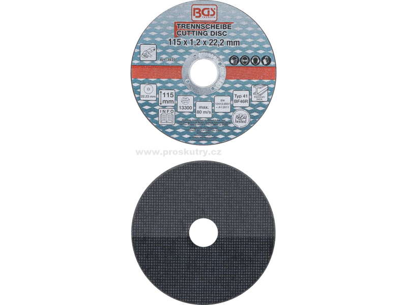 Rozměry: průměr 115 mm, tloušťka 1 mm, vnitřní otvor 22,23 mm
