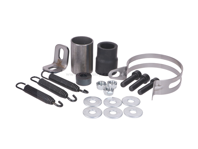 Náhradní držák pro výfuk Voca Cross Rookie 50-70cc CE. Kompletní se všemi pružinami, podložkami, pouzdry, šrouby, silentbloky a podložkami.