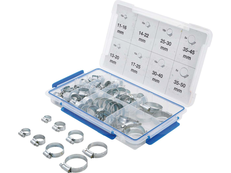 Sada 80 hadicových spon v robustní přihrádkové krabici.