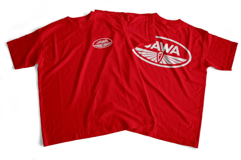 Červené bavlněné tričko s potiskem loga JAWA František Janeček (FJ) na srdci na zádech. Logo JAWA je na tričku natisknuto semišovým „chlupatým“ termotransferovým flock potiskem.