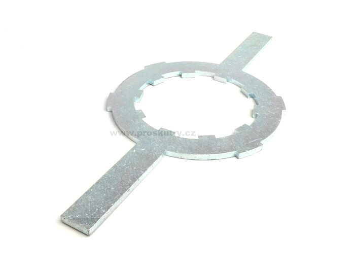 Robustní kovový držák určený k zablokování spojkového koše při demontáži matice nebo montáži spojky.
