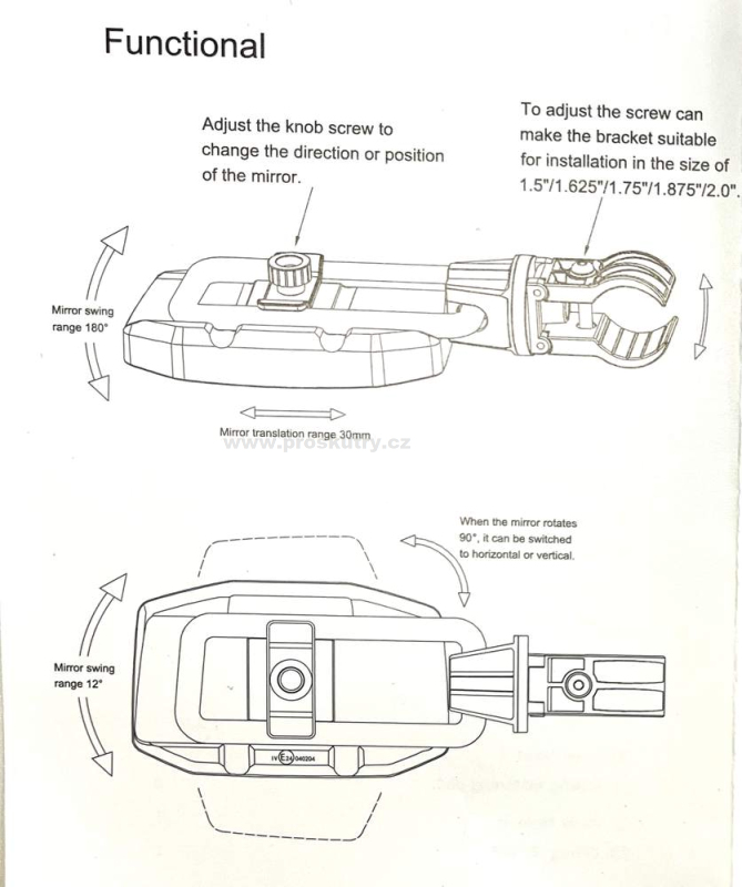 Zrcátka jsou vybavena univerzálním držákem pro rám o průměru 1,5" až 2", což umožňuje montáž na většinu běžných ochranných rámů.